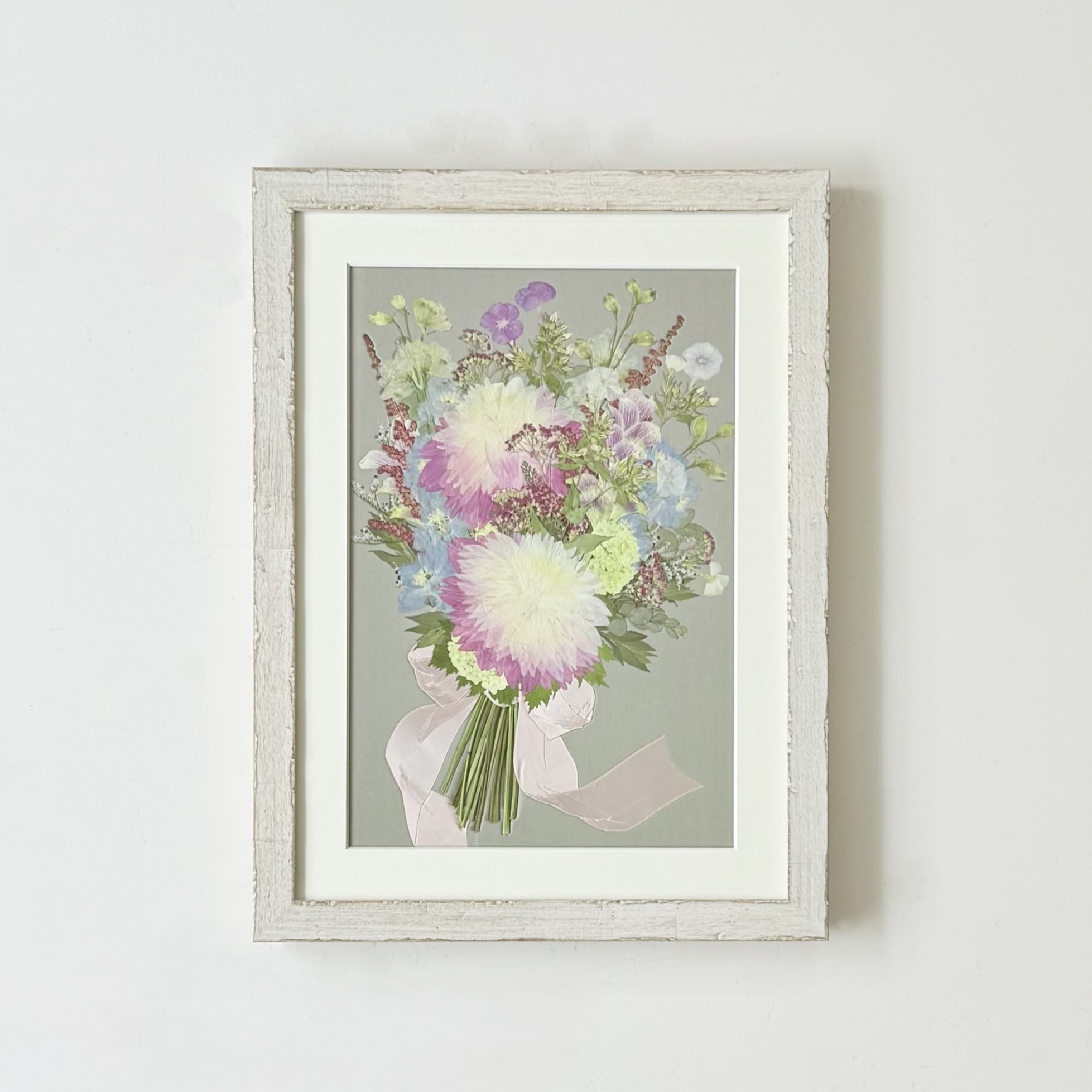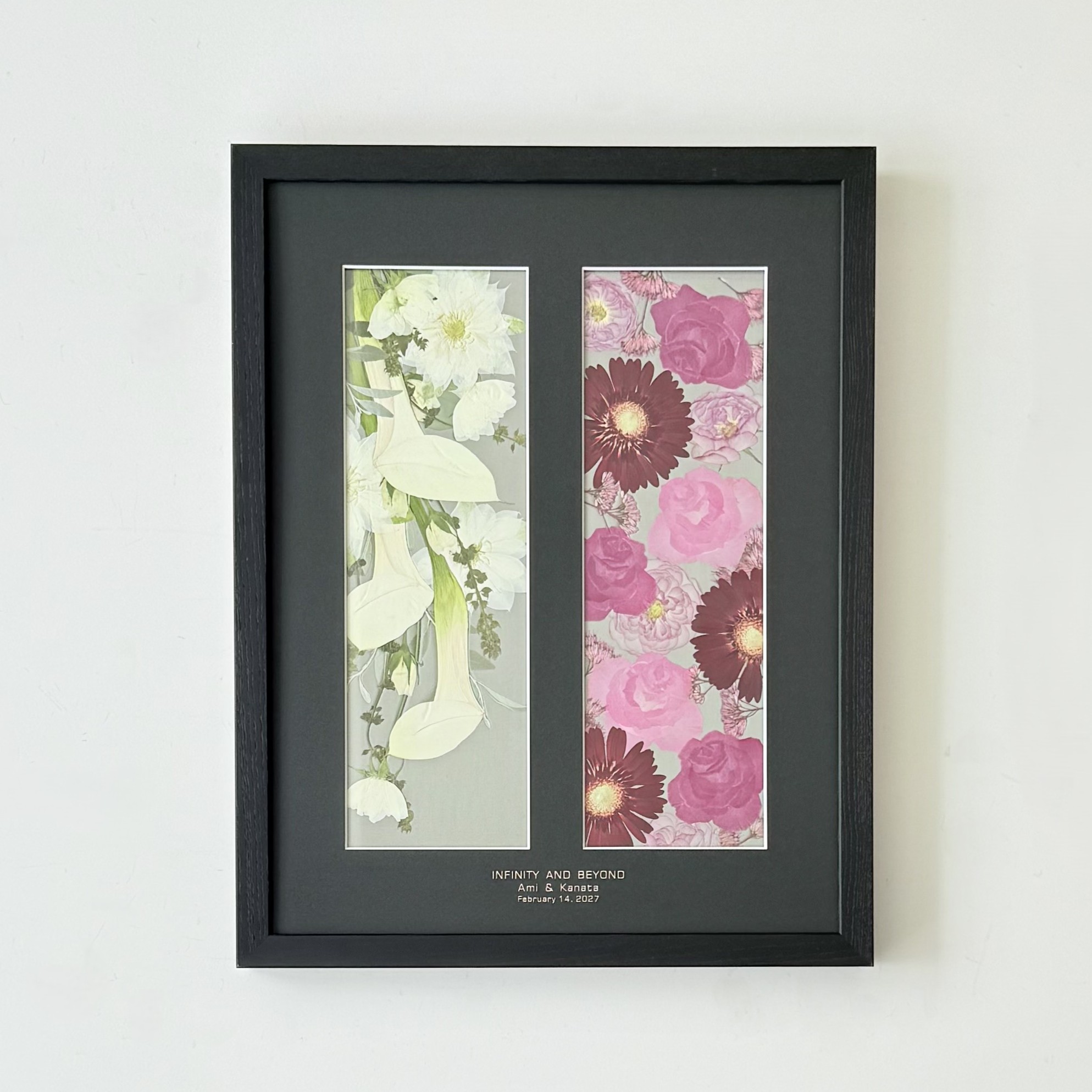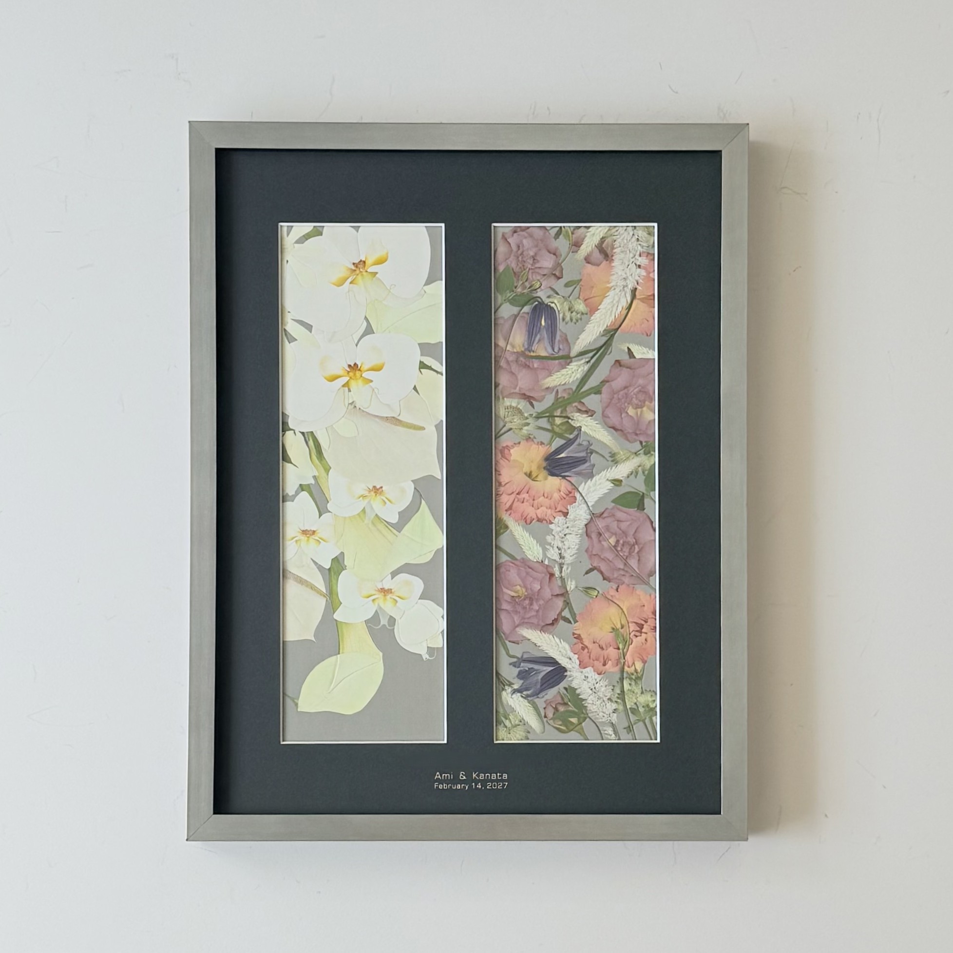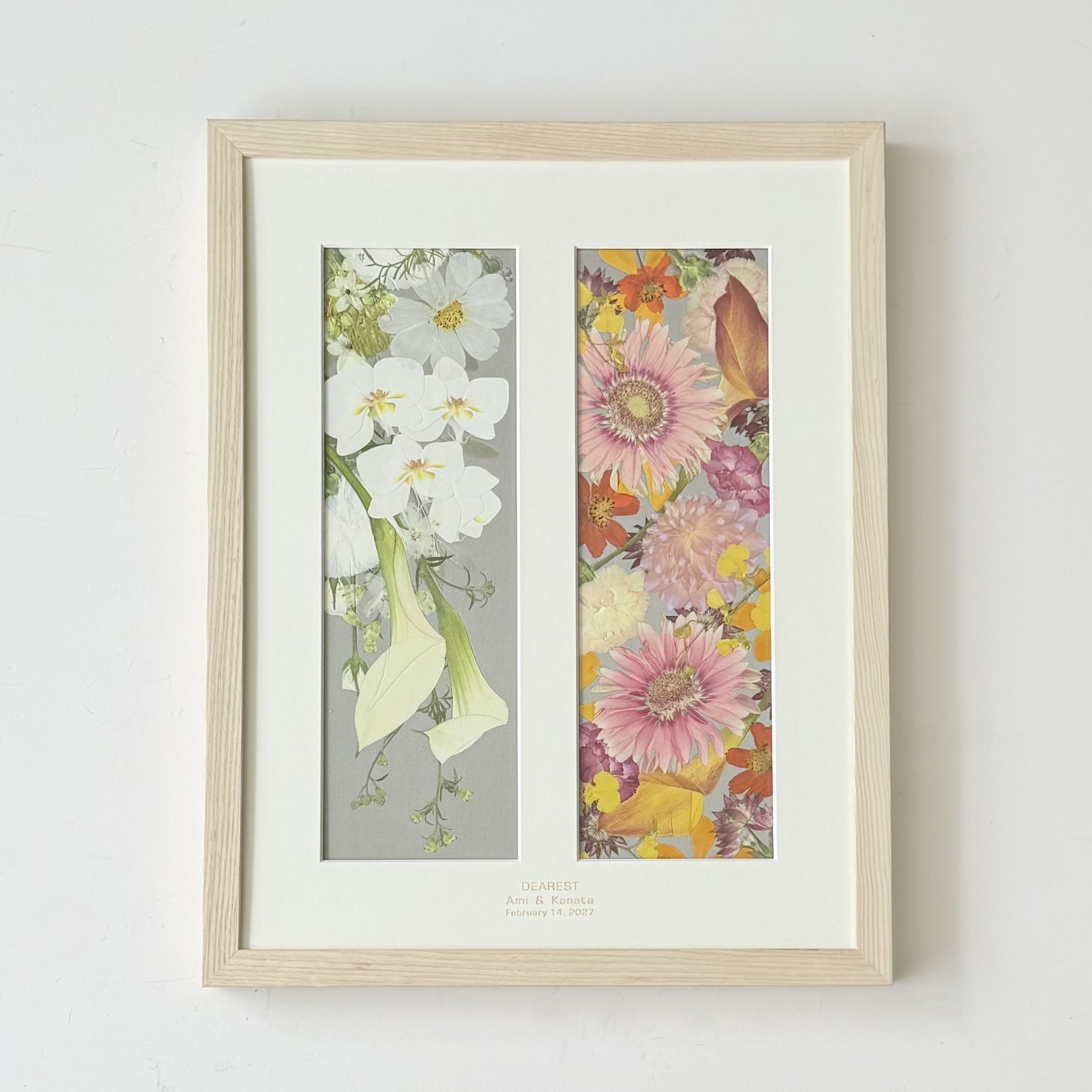 大切お花を持った時にいつまでも咲き続けてほしいと願っていました。 押し花にすることでフレームに入っていつまでもお部屋の中で咲き続けます。 薄いフレームの中咲き続けますので、壁にお花のあるお部屋をご提案させていただきます。