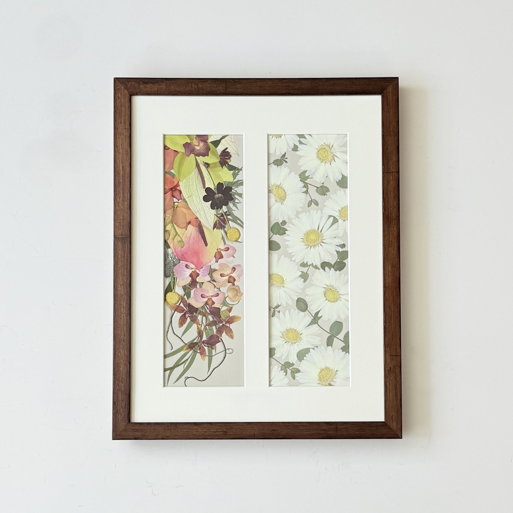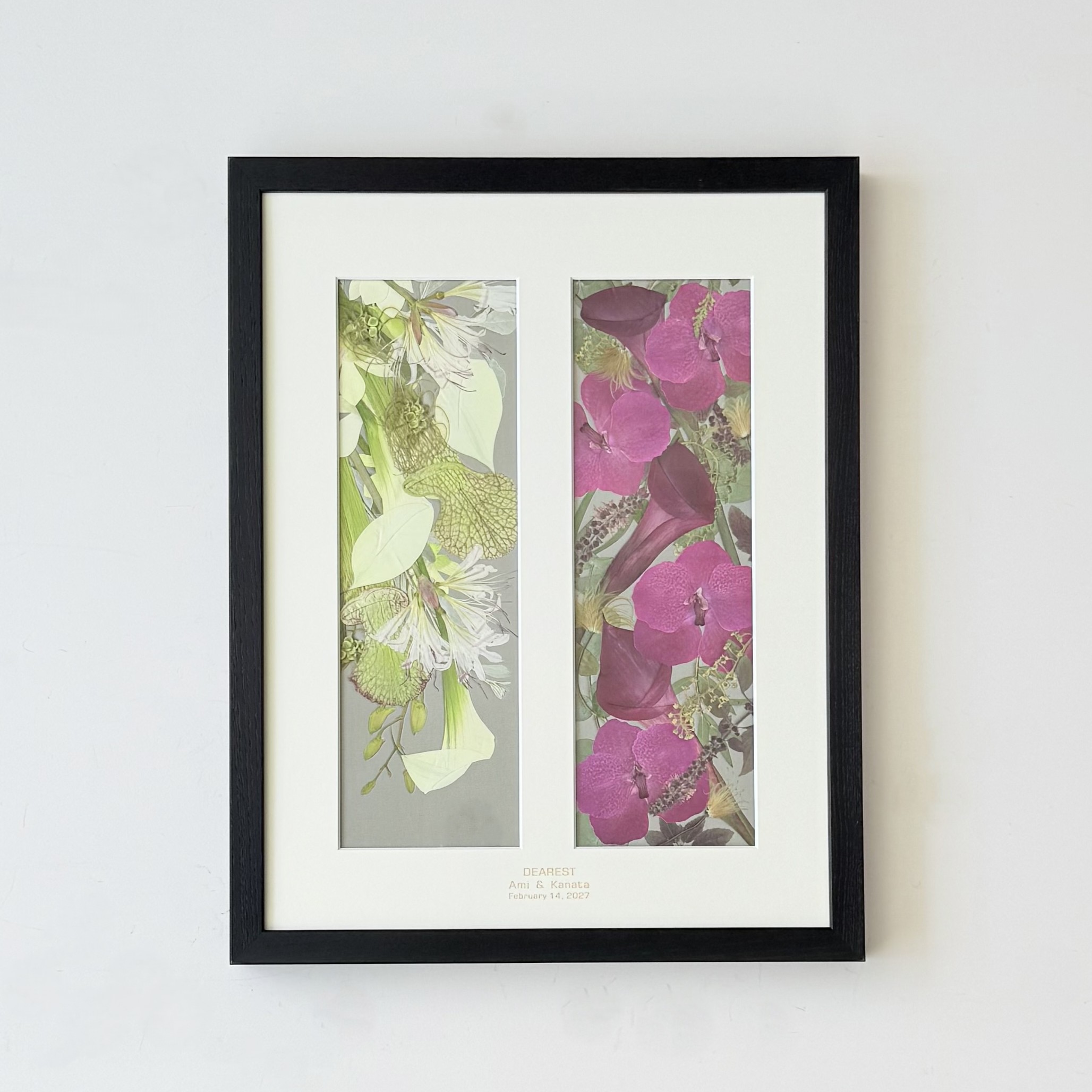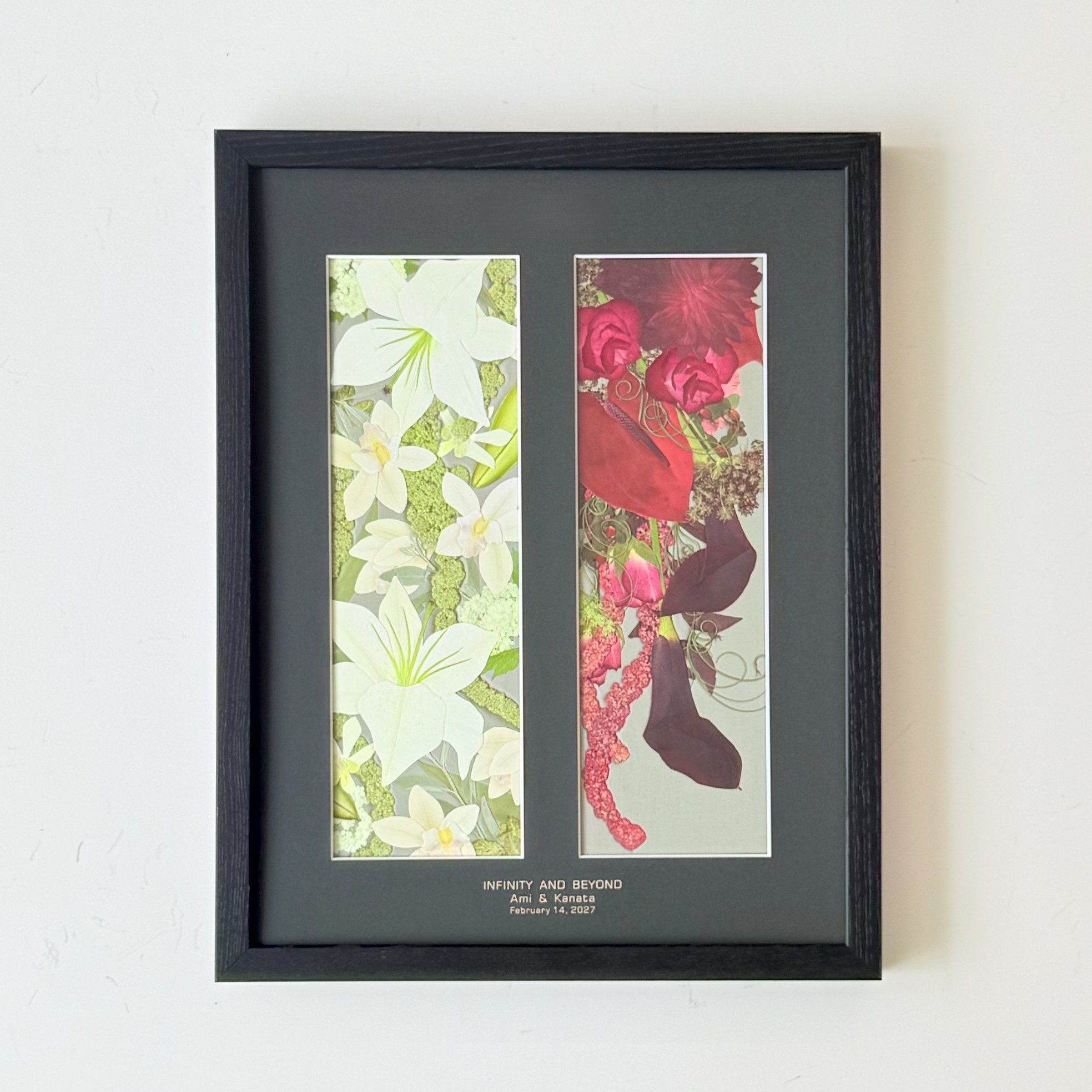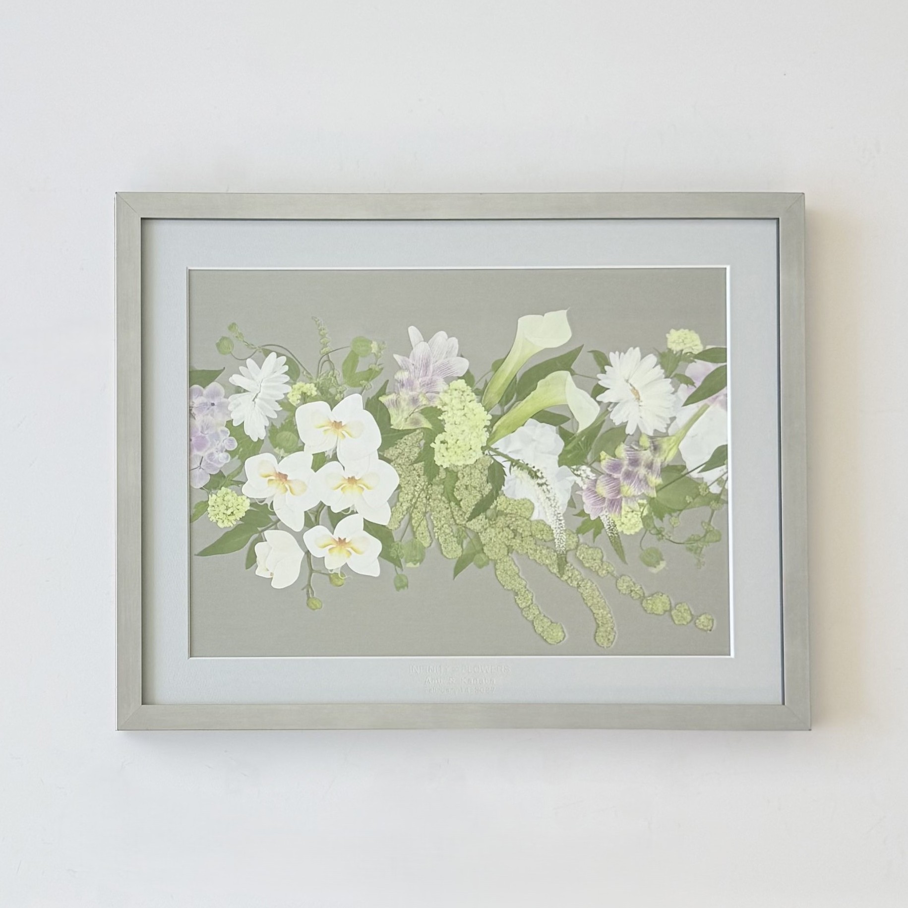 大切お花を持った時にいつまでも咲き続けてほしいと願っていました。 押し花にすることでフレームに入っていつまでもお部屋の中で咲き続けます。 薄いフレームの中咲き続けますので、壁にお花のあるお部屋をご提案させていただきます。