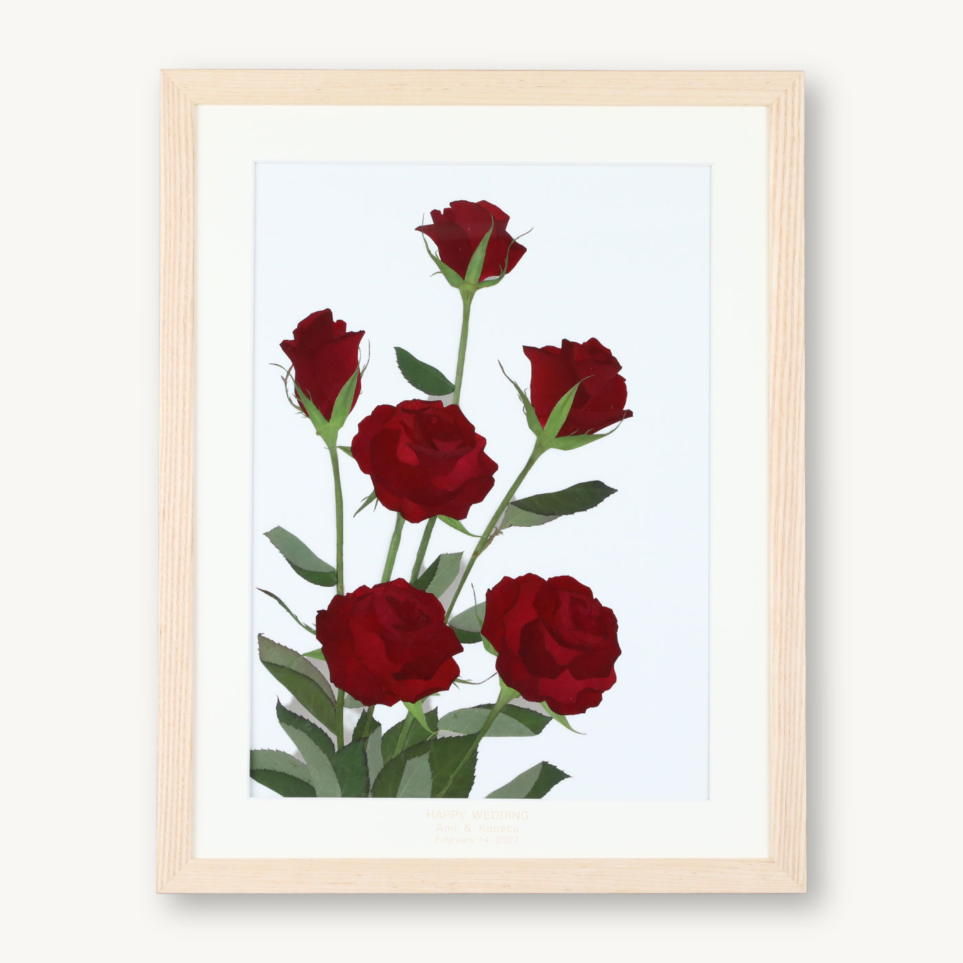 心のこもったプロポーズのお花を残しませんか、気持ちとともにお二人の お部屋にアートとしてお飾りください。 ずっと語り継がれるお花をいつまでもお楽しみください。